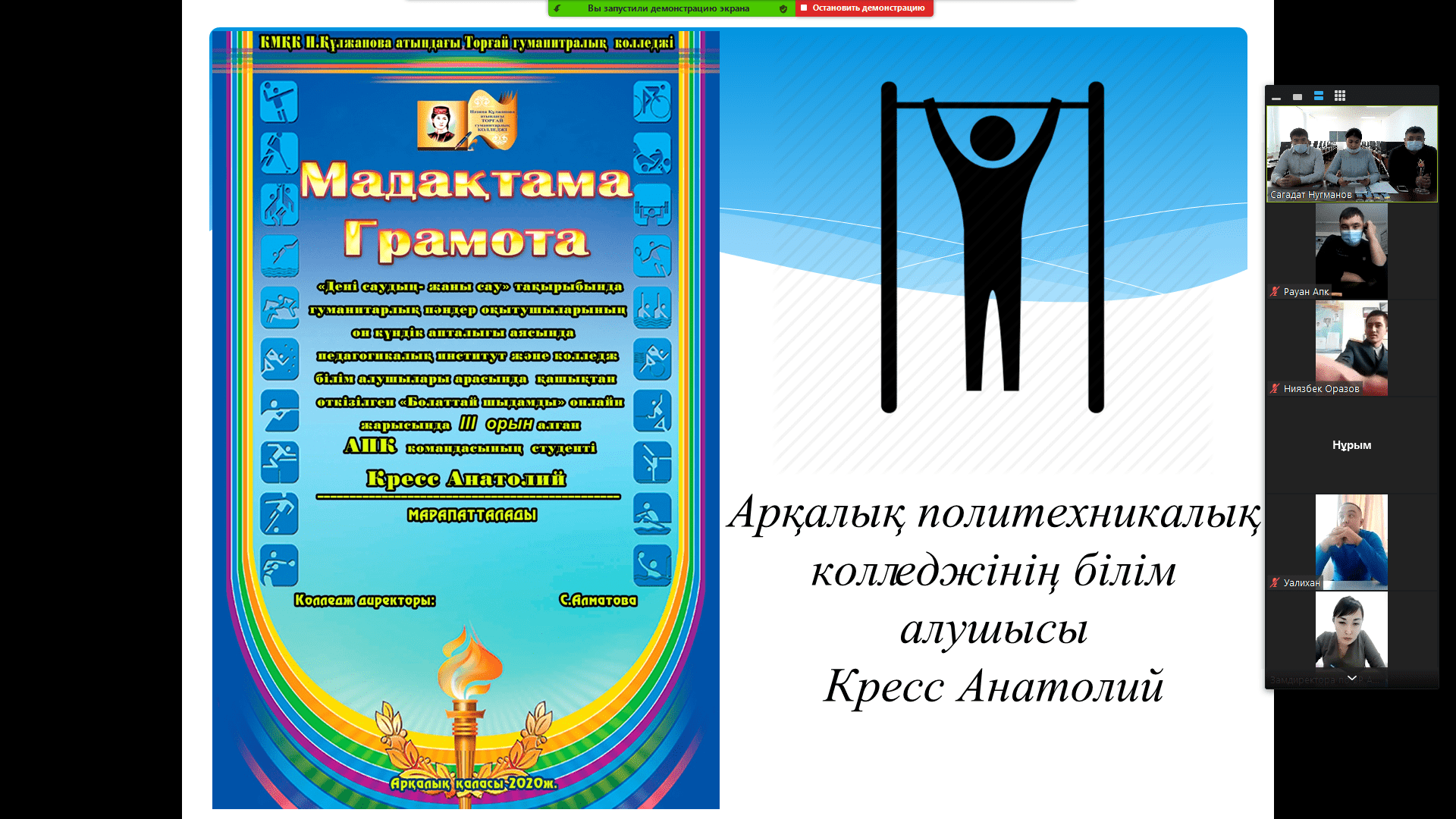 2020 жылы 28 қазанда 2020 жылдың қорытындысы бойынша «Арқалық қаласы әкімдігінің дене шынықтыру және спорт бөлімі» ММ спорт саласындағы жоғары жетістіктерге қол жеткізген спортшыларға, жаттықтырушылар мен осы саланың қызметкерлеріне қала әкімінің атынан дипломдар табыс етілді.
