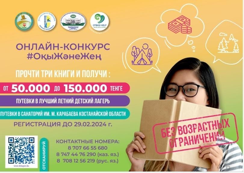 Кітап оқуға құштар жандар үшін керемет мүмкіндік! Тек қана Қостанай облысының тұрғындары үшін 1 ақпаннан бастап онлайн кітап оқу Байқауы бастау алды. Байқаудың ерекшелігі кітап оқу арқылы жүлдеге ие болуға болады. Оқылатын кітаптардың электронды нұсқасы ұсынылған. Әр бала үшін оқуы керек өте қажетті әдебиеттер таңдалған.Байқау талаптары да қатаң емес тиімді құрылған. Барлық колледж студенттері мен қызметкерлерді кітап оқу байқауына қатысуға шақырамыз. Байқауға облыс тұрғындары үш жас санаты бойынша қатыса алады 10 жастан 14 жасқа дейін (қоса алғанда) 15 жастан 18 жасқа дейін (қоса алғанда) 19 жас және одан жоғары Байқау шарттары туралы толық ақпарат http://www.kitap10.kz/ сілтемесі арқылы таныса аласыз. Үш кітап оқы да жүлдеге ие бол. # ОқыЖәнеЖең