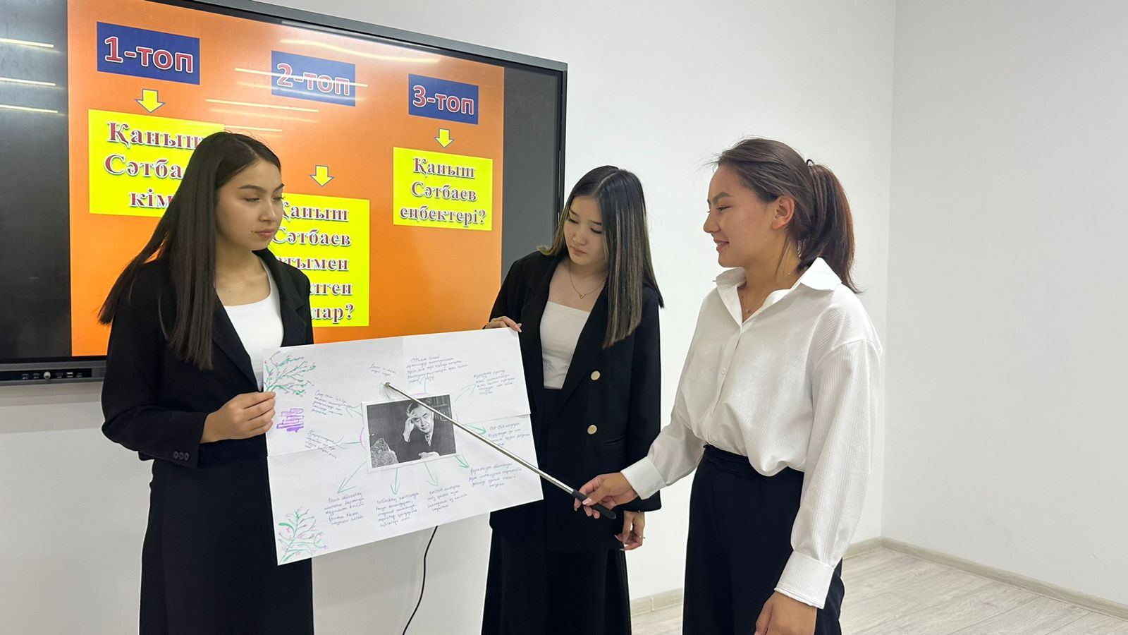 Қаныш Имантайұлы Сәтпаевтың 125 жылдық мерейтойын өткізу бойынша бекітілген жалпыреспубликалық жоспарды орындау шеңберінде бүгін Н.Құлжанова атындағы Торғай гуманитарлық колледжінде студенттер арасында "Қаныш Сәтпаев - алғашқы қазақ академигі тақырыбында " танымдық сағат өткізілді. Шара шеңберінде топтарға "Қаныш Сәтбаев кім?" деген сұраққа зерттеу жүргізіп келу тапсырылды. Нәтижесінде топтар төмендегідей тапсырмаларды орындады.