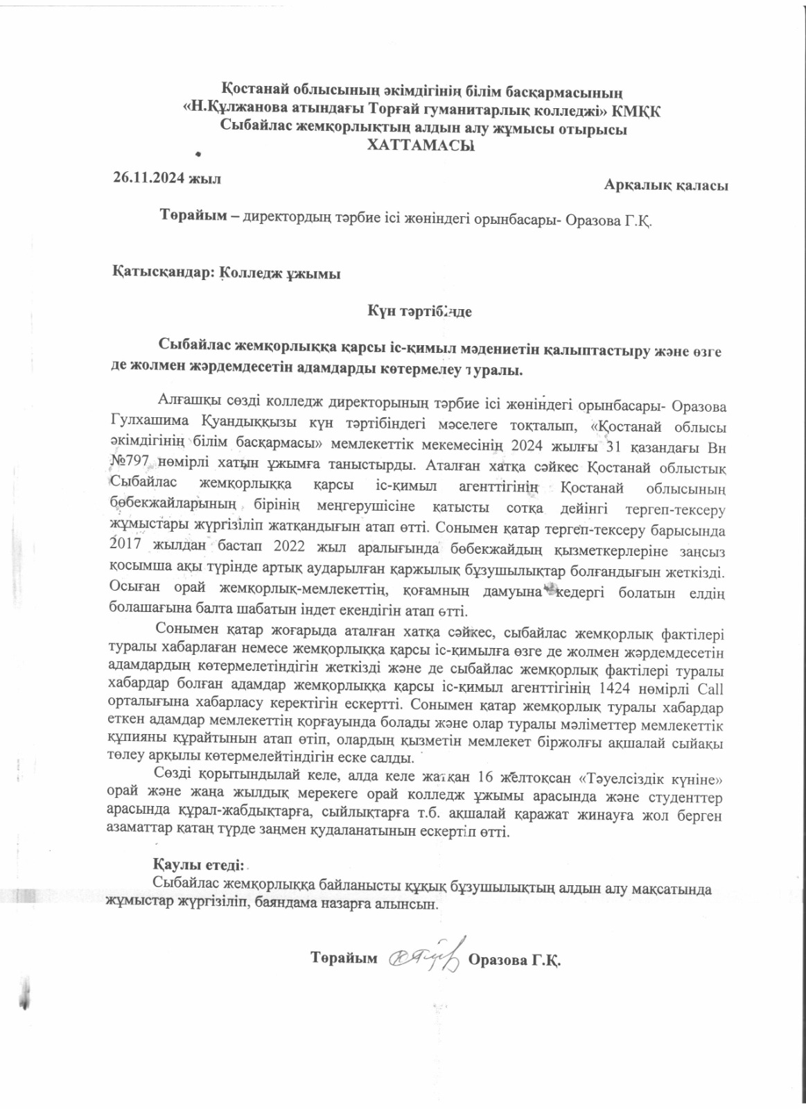 Колледж қызметкерлері мен оқытушылар және кураторлармен "Сыбайлас жемқорлықтың алдын алу жұмысы бойынша" кезекті отырысы өткізілді. Күн тәртібінде: Сыбайлас жемқорлыққа қарсы іс-қимыл мәдениетін қалыптастыру және өзге де жолмен жәрдемдесетін адамдарды көтермелеу мәселесі қаралды. Отырысқа колледж директорының тәрбие ісі жөніндегі орынбасары- Оразова Г.Қ. төрайымдық етті. Күн тәртібі бойынша «Қостанай облысы әкімдігінің білім басқармасы» мемлекеттік мекемесінің 2024 жылғы 31 қазандағы Вн №797 нөмірлі хатын ұжымға таныстырды. Сонымен қатар жоғарыда аталған хатқа сәйкес, сыбайлас жемқорлық фактілері туралы хабарлаған немесе жемқорлыққа қарсы іс-қимылға өзге де жолмен жәрдемдесетін адамдардың көтермелетіндігін жеткізді және де сыбайлас жемқорлық фактілері туралы хабардар болған адамдар жемқорлыққа қарсы іс-қимыл агенттігінің 1424 нөмірлі Call орталығына хабарласу керектігін ескертті. Сонымен қатар жемқорлық туралы хабардар еткен адамдар мемлекеттің қорғауында болады және олар туралы мәліметтер мемлекеттік құпияны құрайтынын атап өтіп, олардың қызметін мемлекет біржолғы ақшалай сыйақы төлеу арқылы көтермелейтіндігін еске салды. Түсіндірме жұмысы барысында қозғалған тақырыпқа сәйкес сұрақтар мен ұсыныстар отаға салынды.