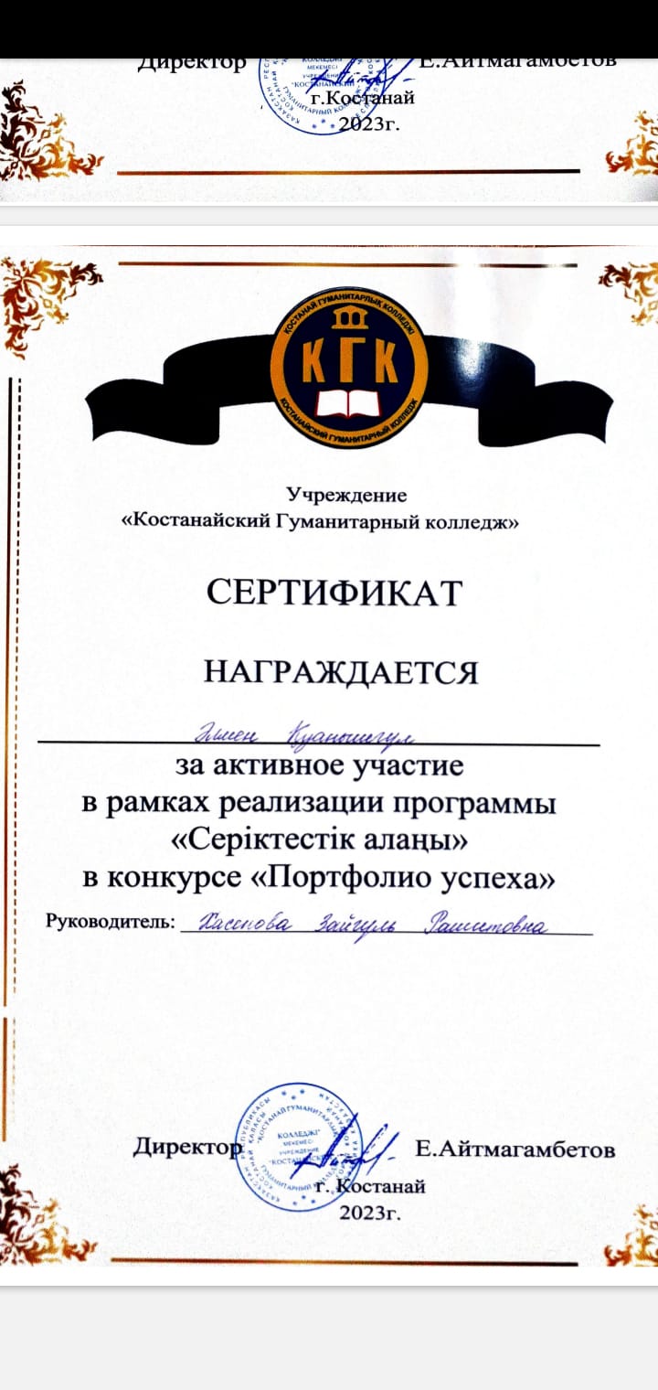 27 желтоқсан 2023 жылы «Серіктестік алаңы» бағдарламасын іске асыру аясында Қостанай гуманитарлық колледжімен бірлесіп «Мектепке дейінгі тәрбие және оқыту» мамандығының білім алушыларының өзін-өзі бьасқаруды жүзеге асыру дағдыларын дамыту және насихаттау мақсатында «Табыс портфолиосы» байқауы ұйымдастырылды.
