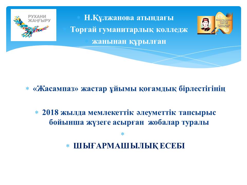 2 слайд Н.Құлжанова атындағы Торғай гуманитарлық колледжінің көпжылдық жұмыс тәжірибесінде, мемлекеттік тапсырыс бойынша әлеуметтік жобаға қатысу, жоба қорғаут.б қоғамдық жұмыстарға қатысып атқару жұмыстары тұрақты түрде жүргізіліп келеді. Нәтижесінде осы жұмыстарды бір арнаға тоғыстырып жүйелі жұмыс жасау мақсатында қоғамдық бірлестікті құру мәселесі қаралып, биыл 2018 жылы 14 сәуірде Колледж жанынан