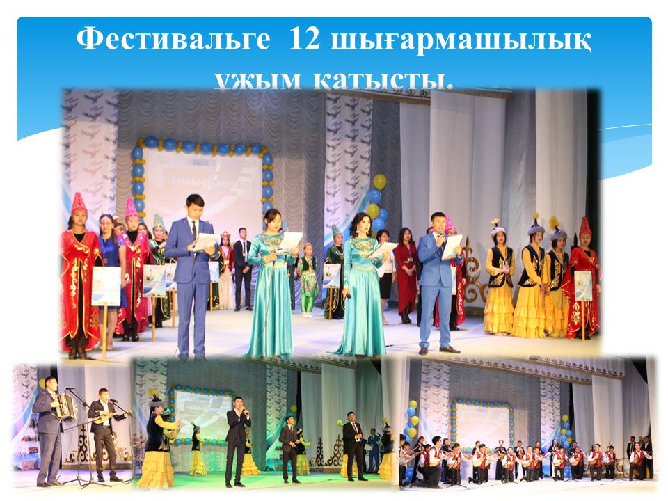 9 слайд Арқалық қаласы, ауылдар мен ауылдық округының халықтың мәдени-ақпараттық сауаттылығын көтеру. Фестивальға қатысуға 15 шығармашылық ұжым сұраныс білдірді, бірақ күн райының қолайсыздығына байланысты фестивальға іс жүзінде 12 шығармашылық ұжым қатысты.
