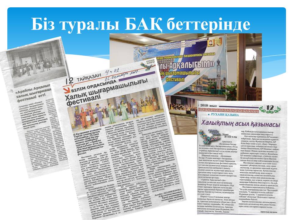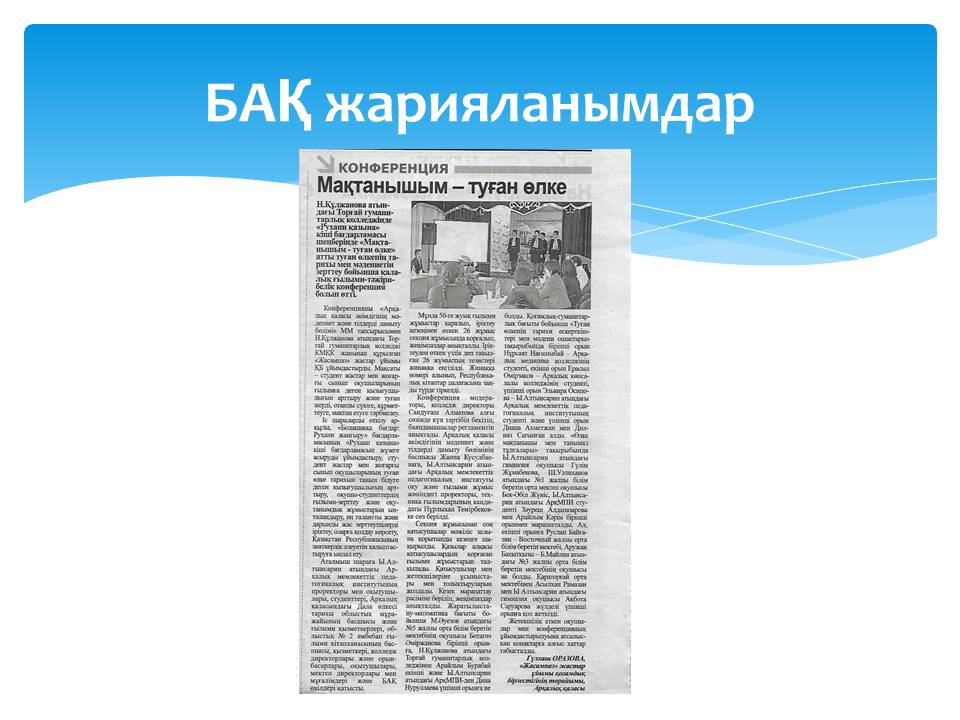 11 слайд (газетные вырезки )Шара туралы БАҚ беттерінде: Облыстық «»Қостанай таңы,«Учительская плюс», қалалық «Арқалық хабары», «Торғай» газеттерінде мақалалар жарияланды.