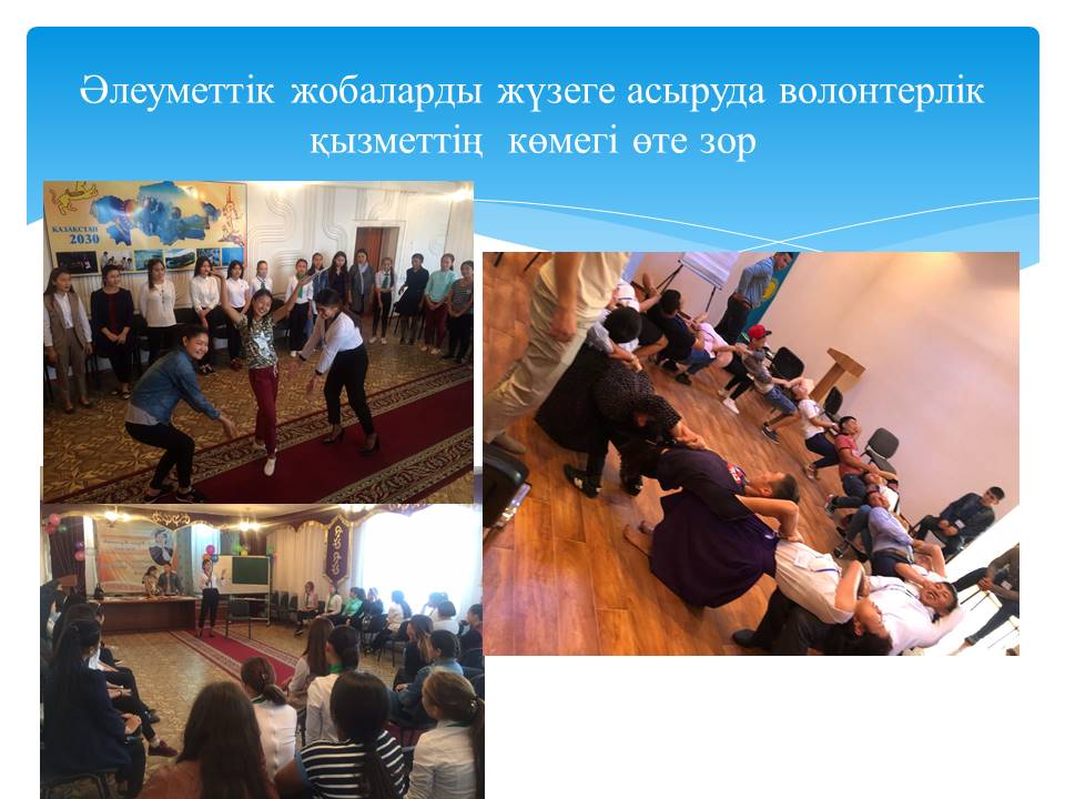 21 слайд Волнтерлер жетістігінің бірі облыстық білім басқармасының ұйымдастырған «Үздік волонтер- 2018» байқауында біздің колледж студенті Бас жүлдені жеңіп алды.Мемлекеттік тапсырыс бойынша әлеуметтік жобаларды жүзеге асыруда волонтерлік қызметтің көмегі орасан зор.