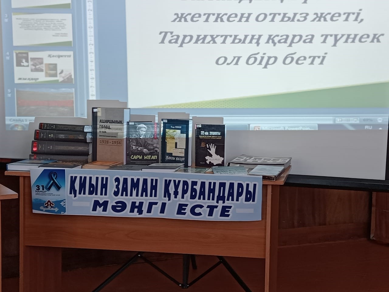Н.Құлжанова атындағы Торғай гуманитарлық колледж жатақхана студенттерімен бірлесіп өткен, қалалық әнбебаб кітапханасында «31 мамыр-Саяси қуғын-сүргін және ашаршылық құрбандарын еске алу күніне» орай өткізген іс шараға