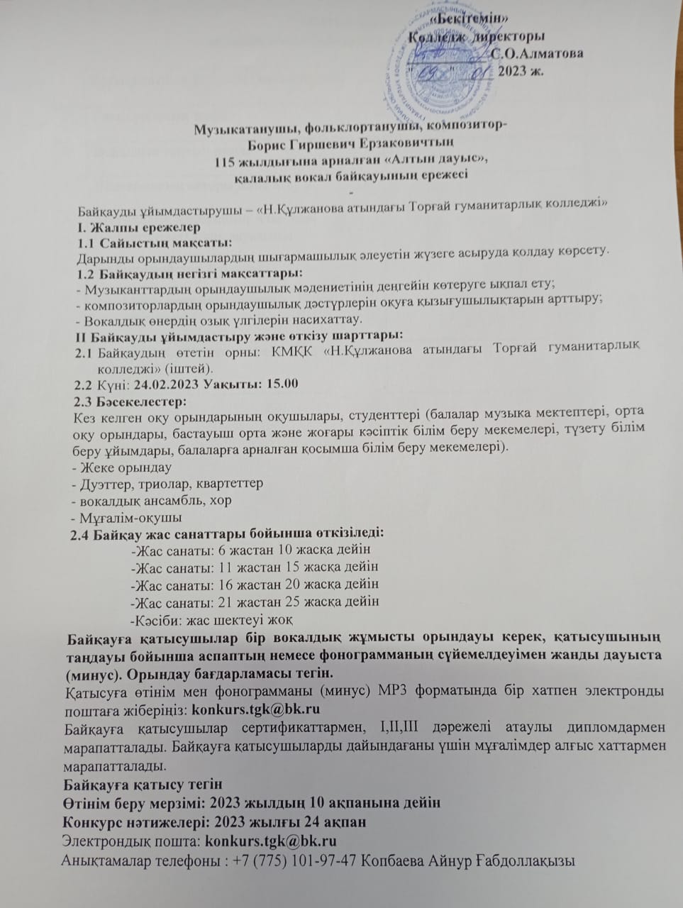 Уважаемые профессионалы и любители вокального искусства г. АркалыкТоргайский гуманитарный колледж им. Н. Кулжановой приглашает вас принять участие в городском конкурсе "Алтын дауыс".Для участия в конкурсе необходимо исполнить одно произведение на выбор участника. До 10 февраля отправить одним письмом заявку на участие и фонограмму (минус) исполняемого произведения.Дата проведения конкурса 24.02. 2023 г. Время: 15.00Электронная почта: Этот адрес электронной почты защищён от спам-ботов. У вас должен быть включен JavaScript для просмотра. Телефон +77751019747